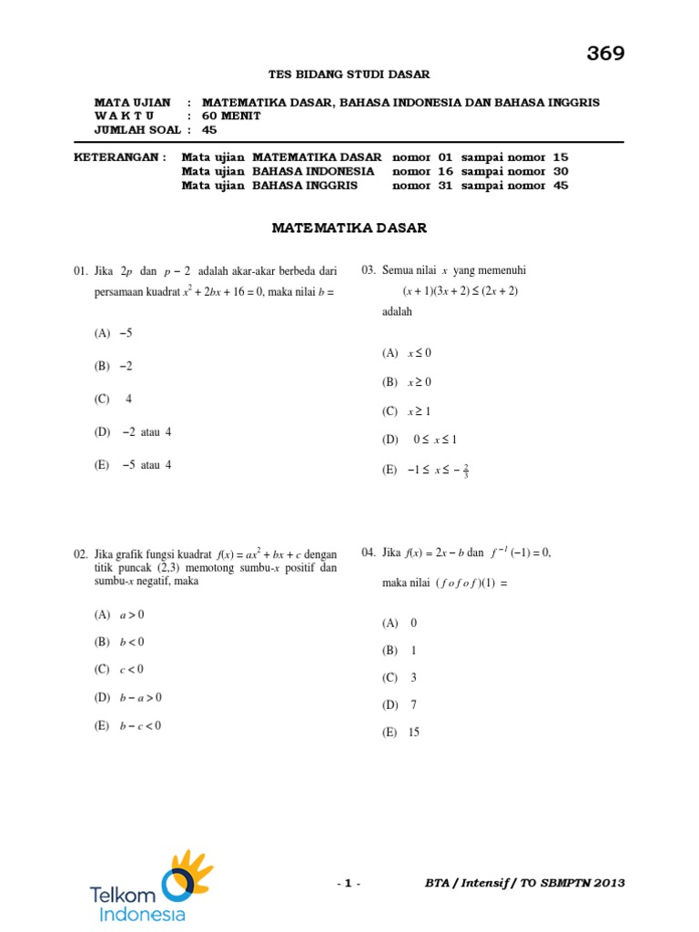 Tes Matematika Dasar. Jadi target prosus inten adalah 100 peserta masuk ptn melalui berbagai jalur yang tersedia. Soal Matematika Dasar Tes Masuk Inten Stai Al Fithrah.
