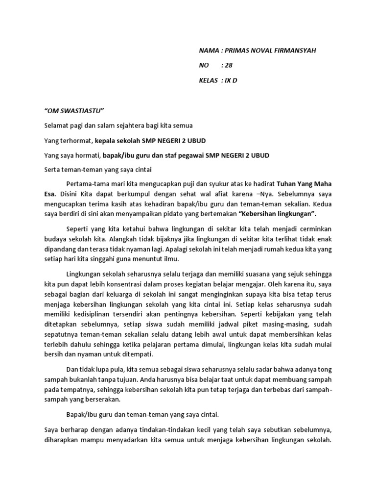 Yang terhormat bapak ibu semua beserta teman-teman yang saya cintai. Pidato Kebersihan Kebersihan Lingkungan sangatlah penting saat ini Karena jika lingkungan kita jaga dengan benar maka akan mendapat dampak yang baik pulaDan kita terhindar dari wabah penyakit. Pidato tentang kebersihan lingkungan sekolah smp pidato tentang kebersihan yang mudah dihafal pidato tentang kesehatan pidato tentang.