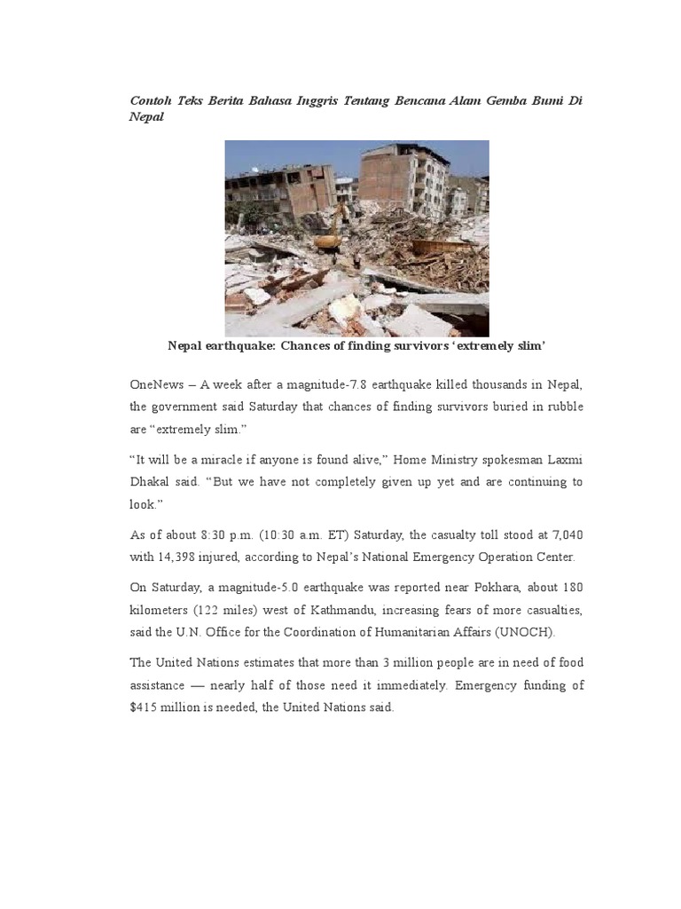 Contoh Teks Berita Bahasa Inggris Tentang Bencana Alam Gemba Bumi Di Nepal
