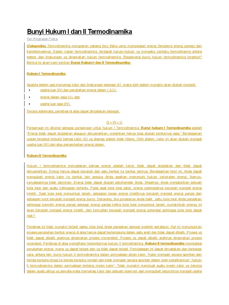 Bunyi hukum termodinamika. Untuk menjelaskan tidak adanya reversibilitas para ilmuwan merumuskan prinsip baru yaitu Hukum II Termodinamika dengan pernyataan. Konsep temperatur hanya berlaku untuk sistem makroskopik. Energi tidak dapat diciptakan maupun dihancurkan hanya dapat melakukan perubahan bentuk.