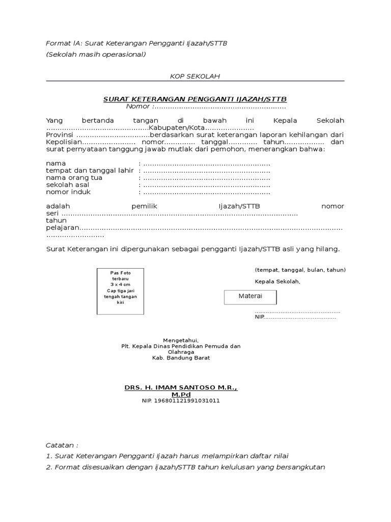 Format Surat Keterangan Penganti Ijazah STTB SD SMP SMA SMK sesuai dengan Peraturan Menteri Pendidikan dan Kebudayaan Republik Indonesia Nomor 29 Tahun 2014 tentang Pengesahan Fotokopi IjazahSurat Tanda Tamat Belajar Surat Keterangan Pengganti IjazahSurat Tanda Tamat Belajar dan Penerbitan Surat Keterangan Pengganti IjazahSurat Tanda Tamat Belajar Jenjang Pendidikan Dasar dan Menengah. Contoh Surat Keterangan Pengganti IjazahSTTB - Untuk Bapak atau ibu guru mungkin postingan kali ini sepertinya sepele hanya Contoh Surat Keterangan Pengganti IjazahSTTB tetapi banyak sekali kasus di lapangan ini terjadi ada Ijazah hilang ada yang rusak ada yang disimpan di lemari malah di makan rayap kutu kayu. Pas photo hitam putih ukuran 4x6 sebanyak 2 lembar.