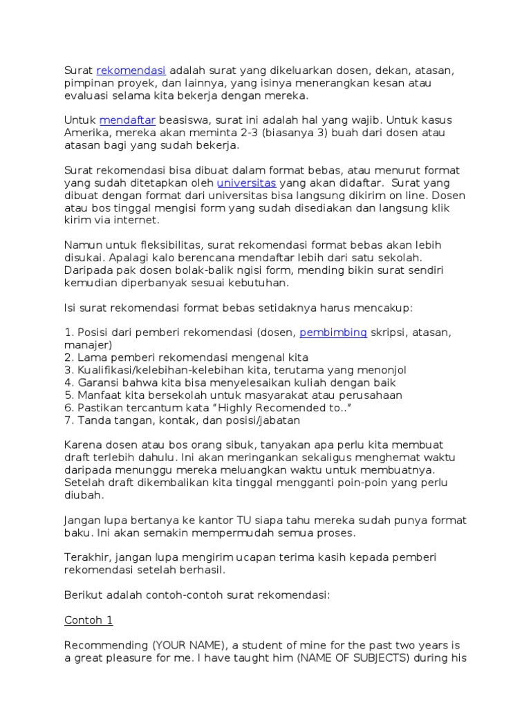 Untuk jenisnya contoh surat rekomendasi pada. Namun sebelum kamu pergi untuk meminta surat rekomendasi kamu harus memastikan bahwa beasiswa yang kamu memiliki format khusus surat rekomendasi atau tidak. Tidak heran jika Pemerintah Indonesia baik dari Pemerintah Pusat sampai Pemerintah Daerah seringkali menyediakan beasiswa kepada para siswamahasiswa yang layak menerimanya begitu juga dengan pihak pihak lain.