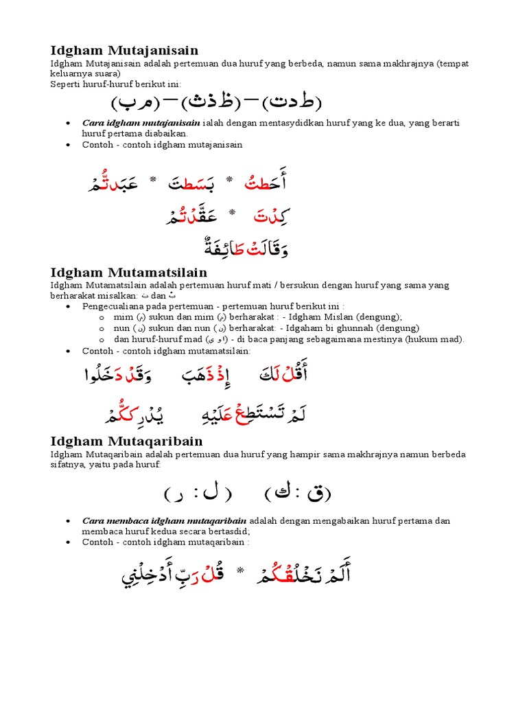 Ayat dalam al-Quran Contoh Huruf ينمؤمــب مه م--ب مهئ اسب مهـئب مأ م--ب ء لب مكلذ م--ب مكاذ ٱتب مكس. Jika Anda ingin mengetahui contoh Idghom Mutajanisain hal yang perlu diketahui terlebih dahulu adalah pengertian tentang idghom itu sendiri. Biasanya huruf kedua dari hukum bacaan Idgham Mutajanisain diberi tambahan tanda tasydid yang menandakan cara bacanya dimasukkan ke dalam huruf kedua sesuai dengan praktek Idgham Mutajanisan.