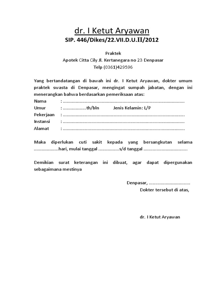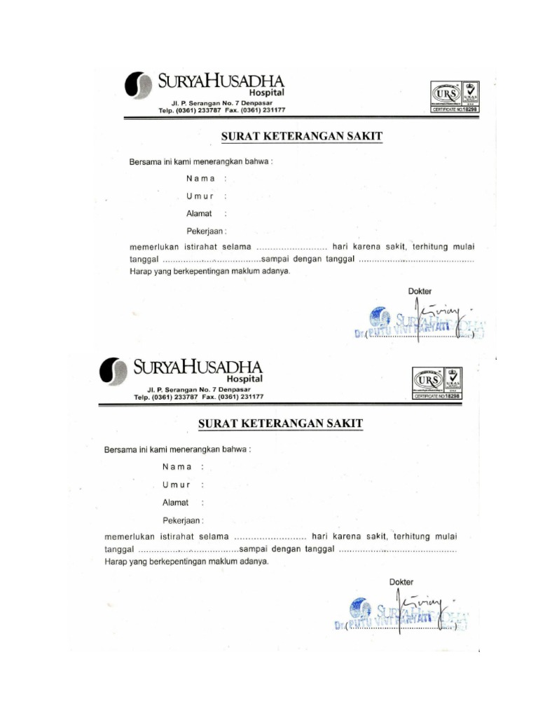 Surat sakit dokter denpasar. Dokter spesialis mata di Rumah Sakit Surya Husadha Nusa Dua dr. Surat permohonan dari rumah sakit 2. Namun jika karyawan tidak dapat membuktikan bahwa ia sakit dengan surat keterangan dokter maka yang bersangkutan dapat dikategorikan mangkir atau bolos kerja Pasal 168 jo Pasal 162 UU Ketenagakerjaan.